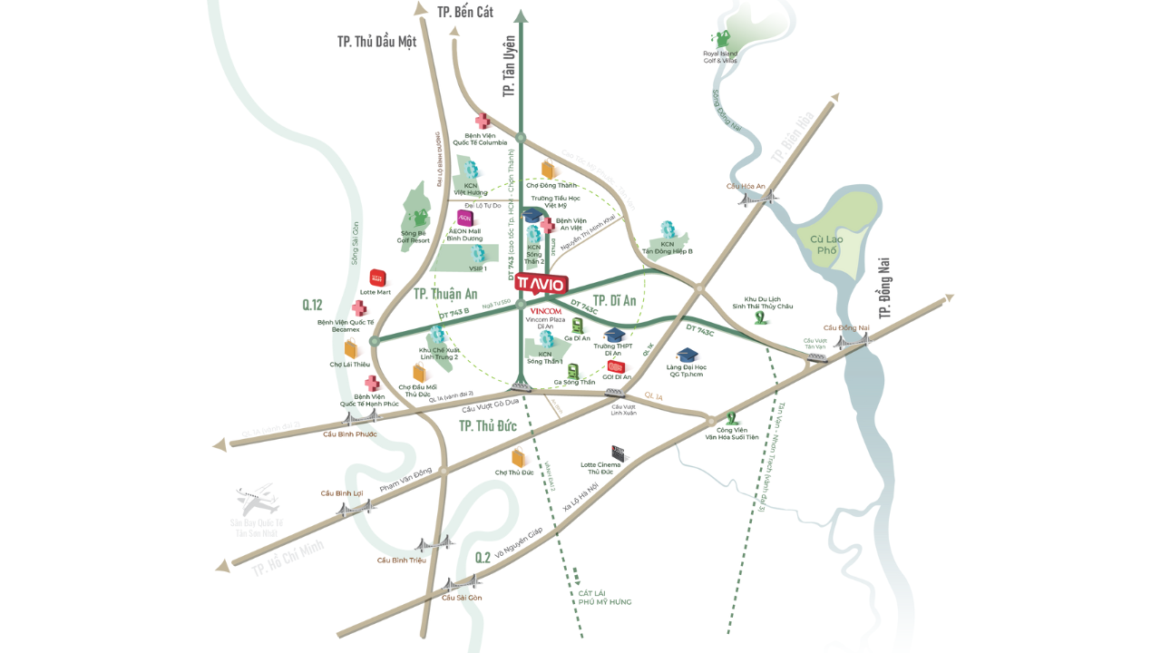 Bao quanh bởi những trục huyết mạch như: Mỹ Phước – Tân Vạn, DT743, Vành đai 2 – Vành đai 3, Phạm Văn Đồng, tuyến Metro số 1 & số 3 mở rộng