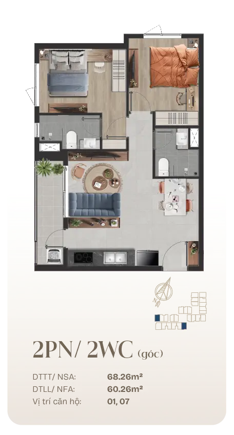 - 2 phòng ngủ: 58–68 m²