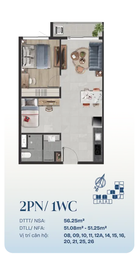 - 1 phòng ngủ+: 52–56 m²